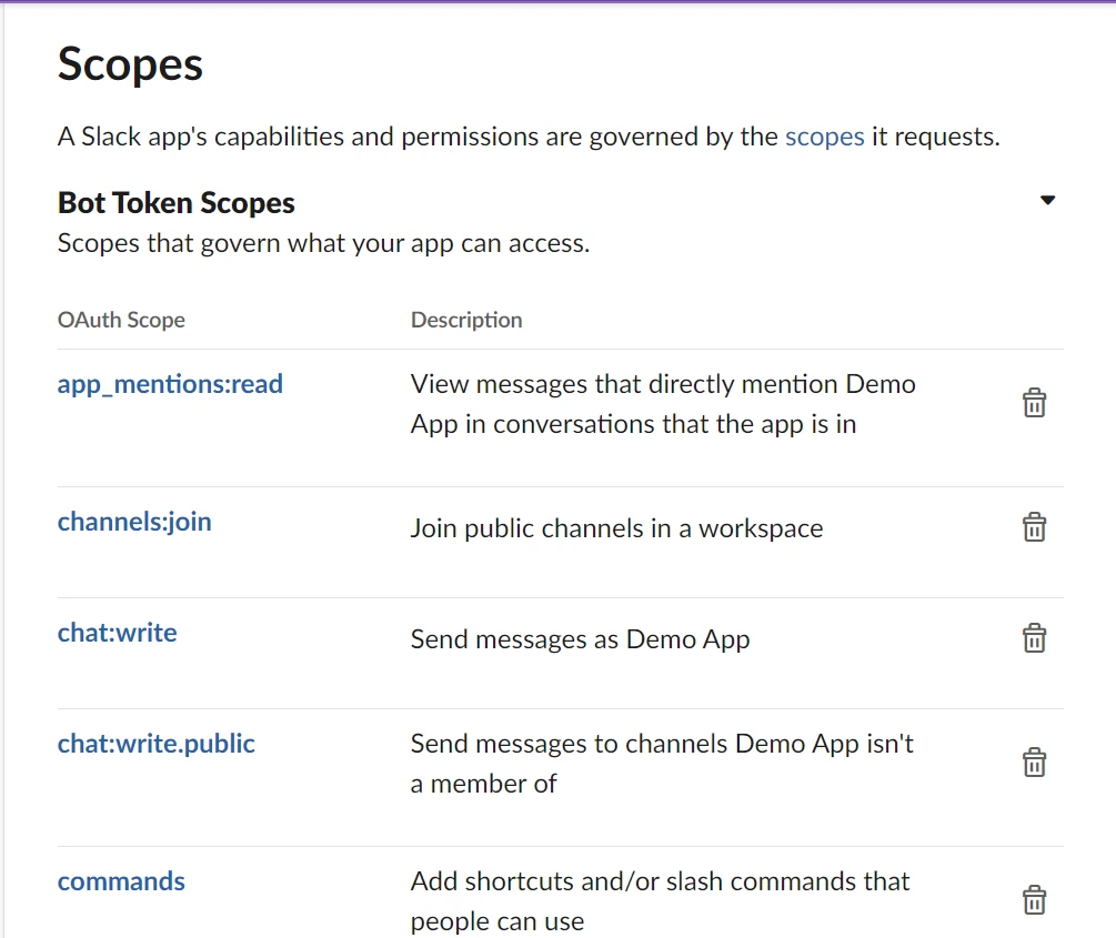 The next step is to give our bot some permissions using slack scopes.