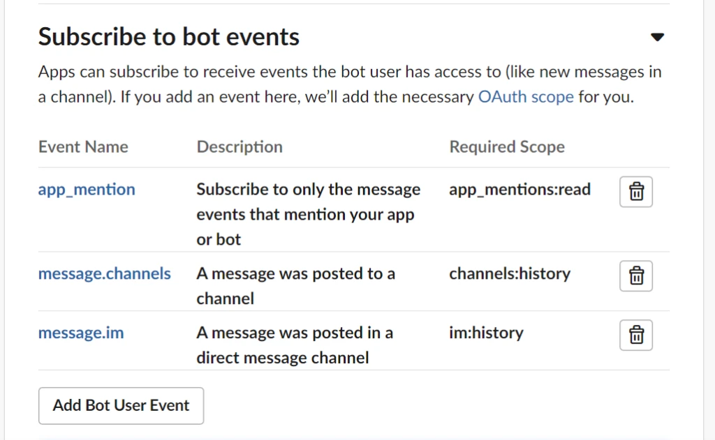 To listen for and receive events from Slack, we will need to set up Event subscriptions.