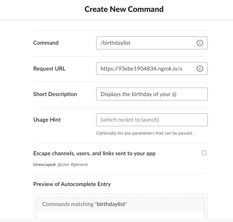 Once you have ngrok setup, navigate to Basic Information > Add features and functionality > Slack commands. For this example, we will be creating a slack command called birthday list.