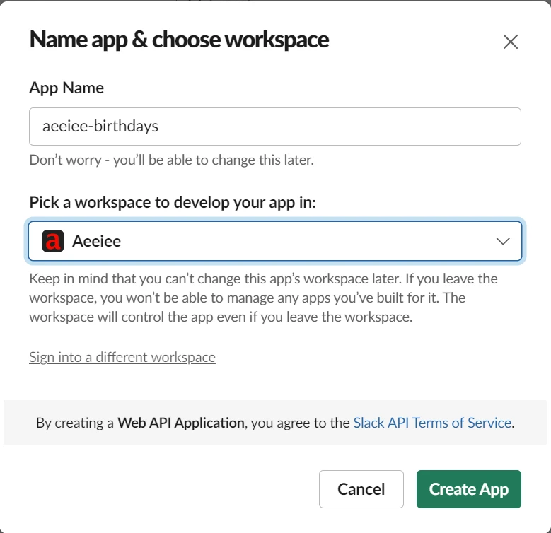 To get started, you’ll need to create a new Slack application. Follow this link to create one. We’ll call our app aeeiee-birthdays. I’ve also selected our internal company workspace aeeiee.
