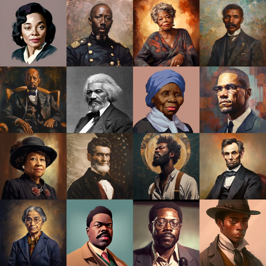 Here are just a few of these heroes that we memorialize in Catch the Ghost (from left to right): Coretta Scott King, Martin Delany, Maya Angelou, George Washington Carver, W.E.B. Du Bois, Frederick Douglass (our mascot), Harriet Tubman, Malcolm X, Dorothy Height, John Brown, Nat Turner, Abraham Lincoln, Rosa Parks, Marcus Garvey, Amos Wilson, Solomon Northup.